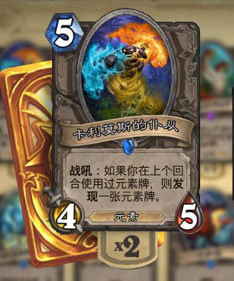 新版本竞技场最强的种族是什么?答案当然是元素了!在勇闯安戈洛中加入了大量元素卡牌,其中中立的元素卡牌更是质量颇高,尤其是卡里莫斯的仆从更是中立元素中的佼佼者。最为一张中立元素,卡里莫斯的仆从可以适用于任何职业,其战吼的发现效果也十分强势,骑士可以用他来发现光螺丝,萨满可以用他来发现蛮荒之主和火、土元素、甚至可以发现风领主奥拉基尔,法师则可以用他来发现派烙斯,就连那些没有职业元素橙卡的职业,也可以用卡里莫斯的仆从来发现一些高质量的中立元素,例如火焰使者等。而它本身也是一个元素,自己发现自己的永动模式也是许多“欧洲人”创造出来的最新玩法,可以说卡里莫斯的仆从是现阶段竞技场中最受欢迎的一张中立卡牌,没有之一。