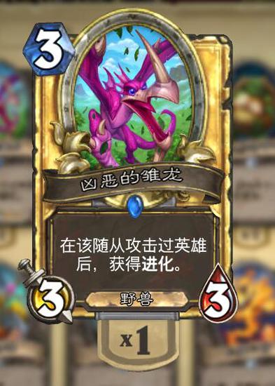 凶恶的雏龙是勇闯安戈洛扩展包中最具特色的一张卡牌,这张广大玩家称为“无解肥“的卡牌拥有着非常强的属性,一旦该随从攻击过英雄即可获得进化,一旦这张卡牌登场而你的对手又在下一个回合无法解决掉它,那么这张卡牌就很有可能变成风怒+潜行+亡语+高攻击+……在3费随从中凶恶的雏龙已经成为高质量的代表,在竞技场中也成为了广大玩家最喜爱的卡牌之一。
