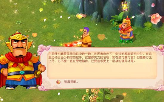 等你将十颗白风精夺回来,精武将军才才告诉你这其实是一位前辈高人留下来的考题,他是希望来此修行的修真者不要因为只顾着欣赏此地的风景而荒废了修行。不过这白风精中的确是封住了一只白风怪,为了考验你的实力,精武将军让你带上那十颗白风精去他身后的阵法中将白风怪召唤出来,然后击败它。