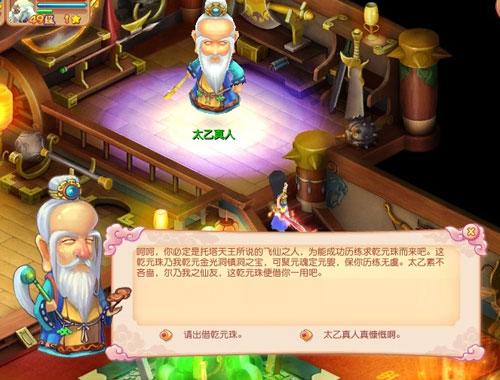 无论你走了哪条道儿,最终都将来到太乙宫,太乙真人便在此处,你可向太乙真人求取乾元珠。这位上古真仙果然仁心慈爱,立刻答应将宝物乾元珠借你一用,还施仙法将你送回飞仙台!