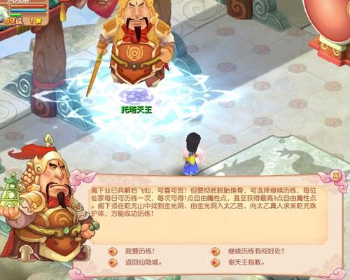 1、飞仙后可通过仙隐城李长空进入飞仙台。 2、若未获得飞升最高9点属性点,可请托塔天王助你历练,每历练一次如渡一重天劫,每次可获得1点自由属性点。 3、若要历练,先得请托塔天王送你进入乾元山,寻找太乙真人求取乾元珠护体。 4、乾元山中金光洞通向太乙宫,往金光洞有两条路。 5、若走乾元山道,则须打败守山者金光麒麟、石灵子、金毛吼,才可进入金光洞。 6、若走乾元迷宫,则有玫瑰仙子、小神匠、碧华仙人、蓝灯道童阻路,分别上缴一朵白玫瑰、一块斑斓石、一个蛋宠之心、一棵幻化草才能继续前行,最后抵达金光洞。 7、从金光洞入太乙宫,向太乙真人借来乾元珠。 8、让太乙真人送你回飞仙台,再凭乾元珠请托塔天王助你主动历练。 9、每天只可历练一次,每历练一次,获得一点自由属性点;获得全部9点飞升自由属性点后,不可历练。 |