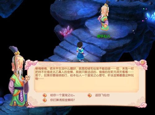在第三处迷宫死角处你碰到碧华仙人,仙君控绒毛仙宠,听闻太乙真人座下有一只金狮,便在此处远远看那金狮……金狮最爱蛋宠之心,你若能送仙君一颗蛋宠之心,仙君自会施仙法,送你继续前行。