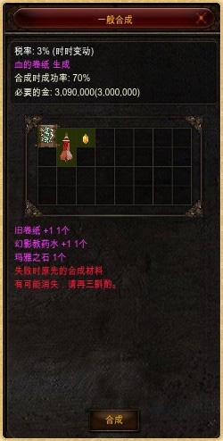 道具名称 合成材料 所需金币 血的卷纸 +1 旧卷纸+1, 幻影教药水+1, 玛雅之石 3,000,000 血的卷纸 +2 旧卷纸+2, 幻影教药水+2, 玛雅之石 5,000,000 血的卷纸 +3 旧卷纸+3, 幻影教药水+3, 玛雅之石 7,000,000 血的卷纸 +4 旧卷纸+4, 幻影教药水+4, 玛雅之石 9,000,000 血的卷纸 +5 旧卷纸+5, 幻影教药水+5, 玛雅之石 11,000,000 血的卷纸 +6 旧卷纸+6, 幻影教药水+6, 玛雅之石 13,000,000