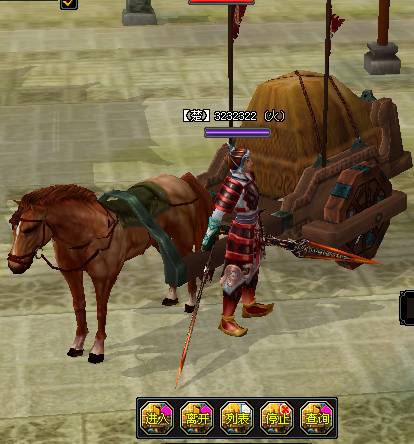 游戏中有一类特殊的任务,他们会要求玩家将镖车护送到指定地点。完成该类任务后,玩家可以获得丰厚的奖励。下图为玩家护送镖车的操作界面: