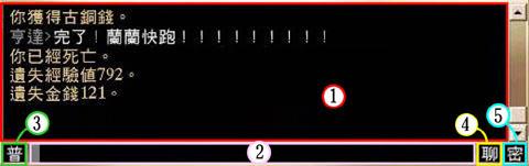 对话窗口分为:显示栏、输入栏、频道选择按钮、聊天室按钮及密语选单五项。