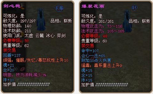 到了45级,“古皇陵”系列副本群可以为您带来属性很好的初级门派套装中的配件;到了48级,“外锁妖塔”副本,除了门派套装配件的掉落外,属性不错的紫色装备同样诱人。除了这些副本掉落的极品装备外,普通任务中难道就没紫色装备了么?答案当然是否定的,在48级以后,您可以分别在“酒坊村”和“望川田”接到紫色属性的武器以及衣服的任务。“酒坊村”的任务完成后会获得吧“爆裂”系列的武器,属性非常之好;在望川田的剑圣那接任务之后,可以获得紫色的“剑心袍”或者紫色的“天斩铠”。注意,在完成酒坊村的某个任务的时候,还会获得紫色的不能修理的“贪心玉佩”哦。拥有了这些装备,必能让您更轻松的驰骋天下。