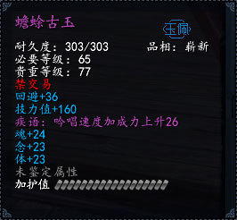 “蟾蜍古玉”玉佩分为两类:一、增加回避值、技力值、法术吟唱速度,提升魂、念、体属性;二、增加回避值、技力值、普通攻击速度,提升、敏、力、疾属性。前者比较适合云麓、太虚等法术输出的职业;后者比较适合天机、荒火等物理输出的职业。