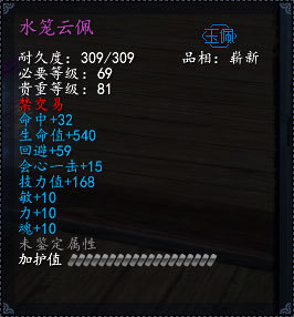 “水笼云佩”是很实用的一件紫色饰品,基本上所有普通玩家所需要的属性都可以通过获得水龙云佩来得到提升。