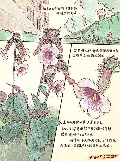 这次涂的花存在于我所寄住的小区中。说来这么灰暗的花真不多见, 而且花上都遍布绒毛,造型惊悚,不知这样是否真的是有诚意找别人帮忙授粉。 但看到小区的草地有好多多这种花,繁殖能力好强~ 想来要么是我们与昆虫们的审美有差异,要么是这种看似毫无诚意的花另有它法~ 总之还是先涂鸦个记录下来~