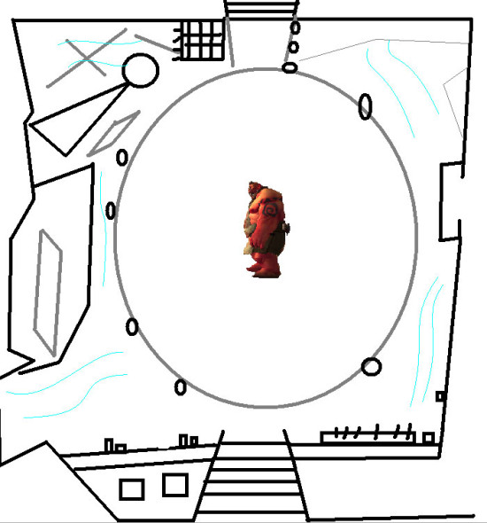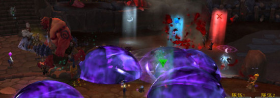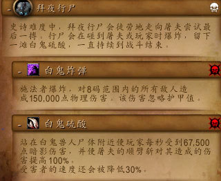 这个技能移动的形式可以看作一个大范围的,难以击杀的巫妖王冰球,这个技能只在史诗模式中存在,移动速度为普通怪物 移动速度,可以被DK冰链减速,可以被沙包挡住,一般我们需要为此技能安排一个专门的沙包来吃这个技能,通常使用一名坦克来做这个沙包。另外使用一名治疗 (奶骑或萨满)在25码外跟随此沙包,白鬼炸弹的爆炸半径远远超过应有的八码,如图: