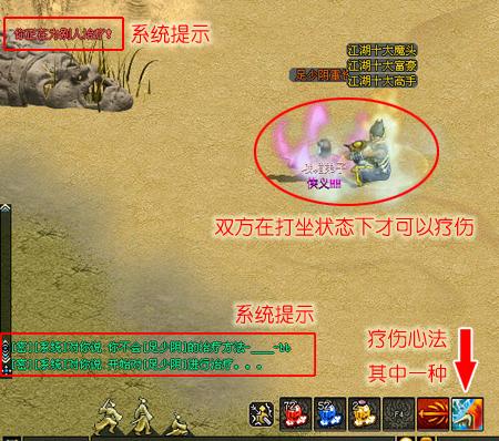 双方打坐。治疗者学会了治疗该经脉受伤的心法。具体操作:双方距离1格,都打坐状态,治疗者按住ALT+左键点击需要治疗者,选择治疗,则治疗开始,一段时间后结束。