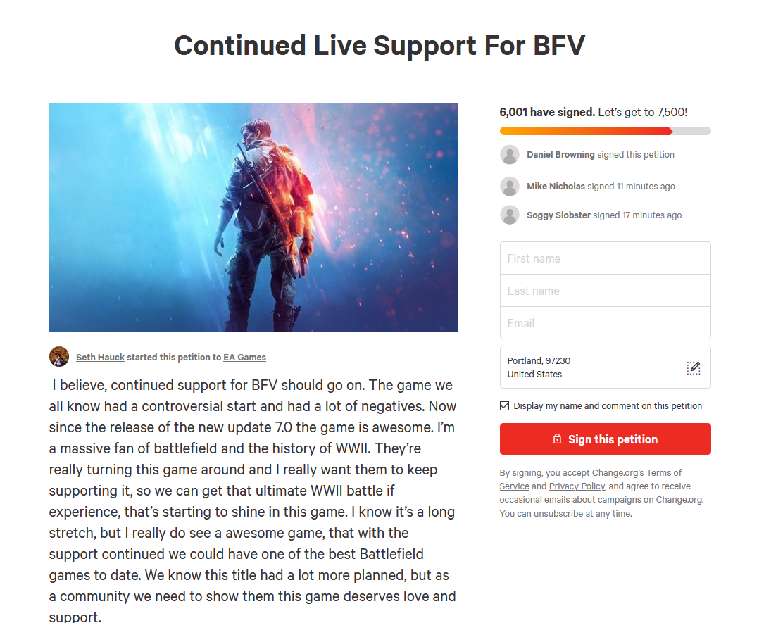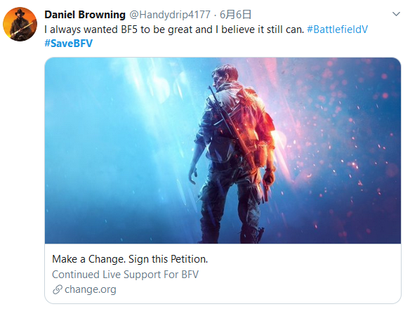 一些玩家甚至发起了请愿页面,并表示:“我认为,《战地5》的持续更新是有必要的,我们都知道这款游戏虽然在一开始出现了一些争议,而且还有不少负面问题。但是,自从7.0版本更新以来,这款游戏已经变得十分出色了。我本人是《战地》系列和二战历史的忠实粉丝,制作者们确实让《战地5》这款游戏耳目一新,我真的很希望他们可以继续为这款游戏提供支持,让我们获得最终级的二战战场体验,这款游戏的闪耀时刻才刚刚开始。我们很清楚《战地5》经历了很长一段时间才走到了这里,但是它确实是一款很棒的游戏。我们也清楚制作方在该系列还有很多计划,但是我们玩家社区也样也要传达我们的想法。”
