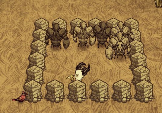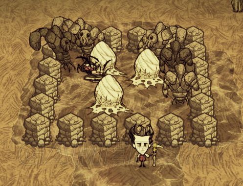 tips2:蜘蛛巢位置建议不要太靠近石墙,因为后期蜘蛛巢变大,岩石大龙虾变大,岩石大龙虾脚下的战利品会很难收集到,需要把岩石大龙虾挤开,所以可能每排6石墙太小一些,每排需要7-8石墙。