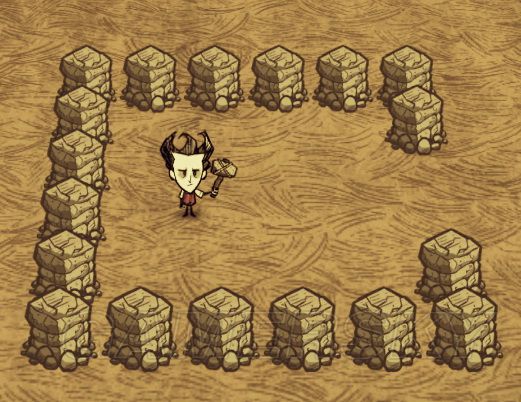 如图所示,首先需要构建石墙屏障(具体大小可以视情况而定)。石墙作用主要是防止岩石大龙虾走出农场,只需要保证岩石大龙虾无法出去即可,所以石墙可以间隔放置,不必造满,可以有一个墙的间隔,也可以用路标代替石墙。