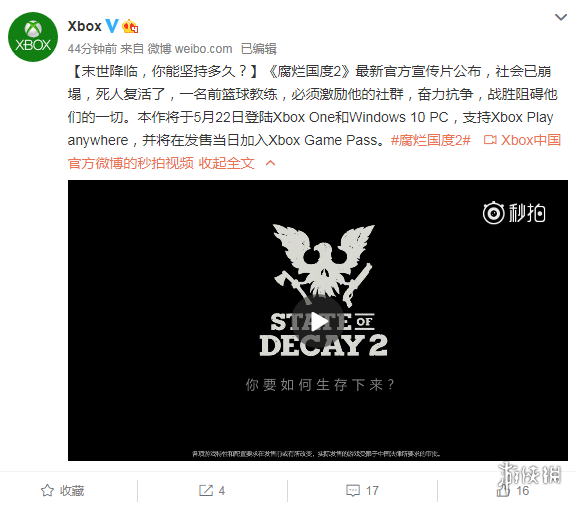 《腐烂国度2》将于5月22日登陆Xbox One和PC平台。