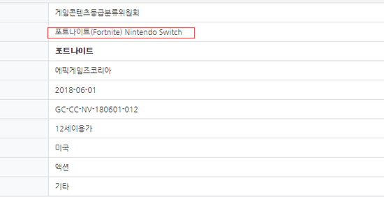 外媒gematsu为我们分享了《堡垒之夜》的最新消息,韩国评级网站已经完成了《堡垒之夜》Switch版的评级,大家可以看到Fortnite Switch的字样,日期是6月1日,在这个评级信息之前,就传言《堡垒之夜》Switch版会在E3公布,现在看来可能性很大。