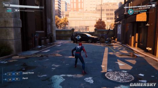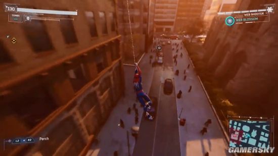 演示前半段是官方人员进行的《蜘蛛侠》试玩,操纵蜘蛛侠,甩荡蛛丝,在纽约曼哈顿的楼宇之间自由冒险,超爽的移动机制,让玩家可以进行畅爽的探索,还能在大楼墙壁上跑酷。
