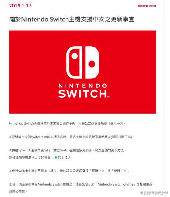 香港任天堂宣布,Switch主机预定于未来数日进行更新,更新后主机语言可显示中文!