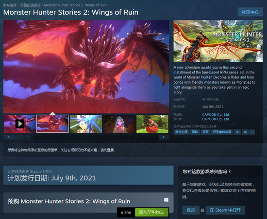 目前,《怪物猎人物语2:毁灭之翼》已经在Steam平台开启预购,国区标准版售价396元,豪华版售价470.25元,本作将于2021年7月9日(五)在NS和Steam平台推出。