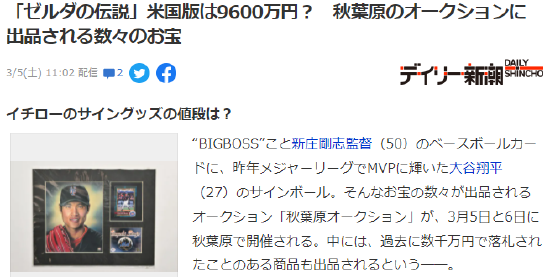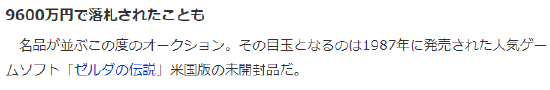 3月5日在素有动漫游戏天堂的秋叶原举行了《秋叶原大拍卖》活动,其中一个未开封的美版《塞尔达传说》拍出了9600万日元天价,一起来了解下。