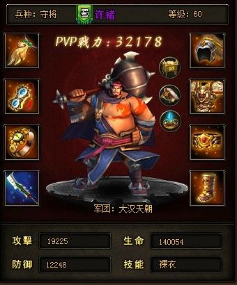 许褚是37wan《龙将2》60级武将中第一位登场的将领,他曾是曹操之贴身护卫,因“裸衣斗马超”之壮举,被好事者称作“虎痴”。作为60级守将,许褚的技能是“裸衣”,攻击敌军单体,威力极大,下一回合不能行动,但提升自身闪避。觉醒技能是“虎痴”,可攻击敌军前军一排。