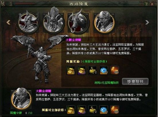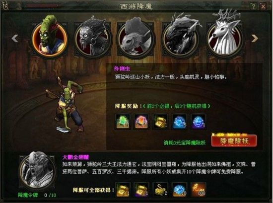 当玩家等级大于20级时,自动开启9377《玄仙传奇》西游降魔任务,点击即可参与活动击杀各种妖魔,获得奖励。妖魔总共19个,每天可以免费击杀第一个,每个妖魔都有几率获得降魔令,集齐10个可免费降服终极BOSS金翅大鹏雕一次。杀3、7、13个boss可以获得额外奖励:降鬼宝箱、降妖宝箱、降魔宝箱。