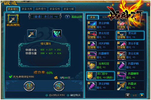 战神天下装备都是可以进行强化从而对装备的基础属性进行提升,装备强化的过程中是能够直接升级的,就算不成功的话,也是能够在装备当前的强化等级获得到部分的强化效果的。