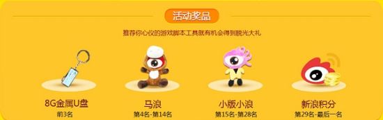 11月10日——11月17日,新浪页游助手为玩家们特别策划了“脱光”分享活动。活动期间,玩家将页游工具分享给其他玩家,通过分享链接下载新浪页游助手,就能获得一颗爱心奖励,推荐的链接越多,所得的爱心也将越多。爱心排行前列的玩家将获得丰厚的实物奖品,奖品包括金属U盘、玩偶以及新浪积分奖励等。