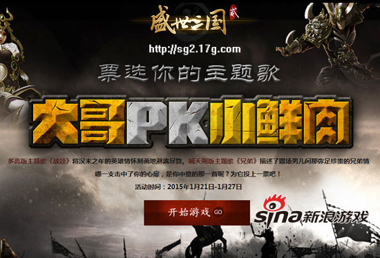 作为国内首个双主题曲网游巨制,新浪游戏隆重摆擂,让《盛世三国2》的所有支持者票选心目中的主题曲!一位是好声音实力学员、华语乐坛情歌新秀多亮,一位是流行乐坛实力派的代表人物之一臧天朔;一首《战颂》描绘了骁勇坦荡的英雄气概,一首《兄弟》倾诉了疆场男儿的手足情怀。到底那一支歌曲击中了你的心扉?快来为它投上一票吧!另外,积极参与活动的玩家还有机会赢得精美实物礼品一份哟,快快加入吧!