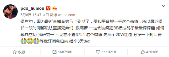 因为与直播平台的合约问题,LOL顶级主播PDD已经二十多天没有做直播了,在此期间也没有发布任何一则消息透露谈判的近况。在PDD发布的最后一则微博中,称要抽出20万的大奖,而这则微博的转发量已经达到了惊人的100万+,足可见得PDD的影响力。