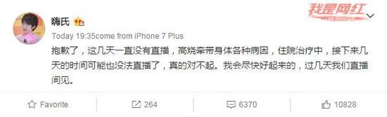 不过这几天嗨氏确实未有在斗鱼开播,此前斗鱼TV欢迎嗨氏入驻的微博也已遭到了删除。嗨氏本人则在微博公开表示,近期因持续高烧等身体原因,住院接受治疗。值得一提的是,嗨氏在微博中表示,自己将在一段时间后恢复直播。(本文转自网易)