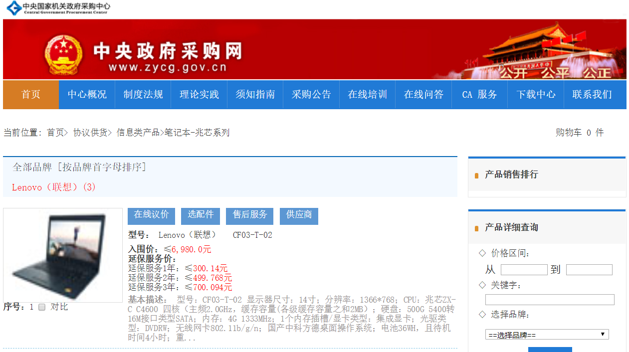 另外根据中央政府采购网信息显示,已经有数款搭载兆芯处理器的产品入围政府采购网集市,大多是由联想提供的笔记本、台式机产品(含显示器),最低价格在4000多元。
