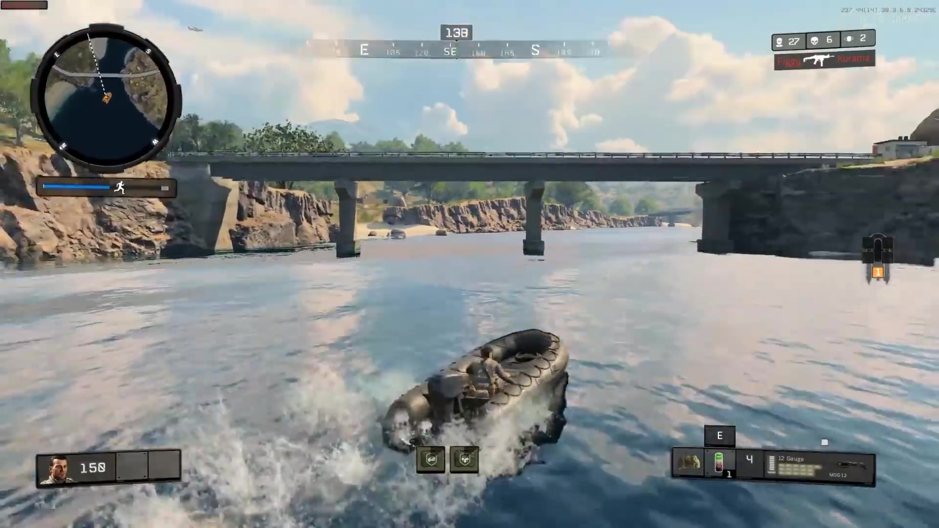 我们看到熟悉的高空翼装滑行和跳伞,也看到了熟悉的不断缩小的白圈。玩家登上快艇以后会切换为第三人称视角。主视角在进入白圈以后立刻遇到了其他玩家并被迅速射杀。