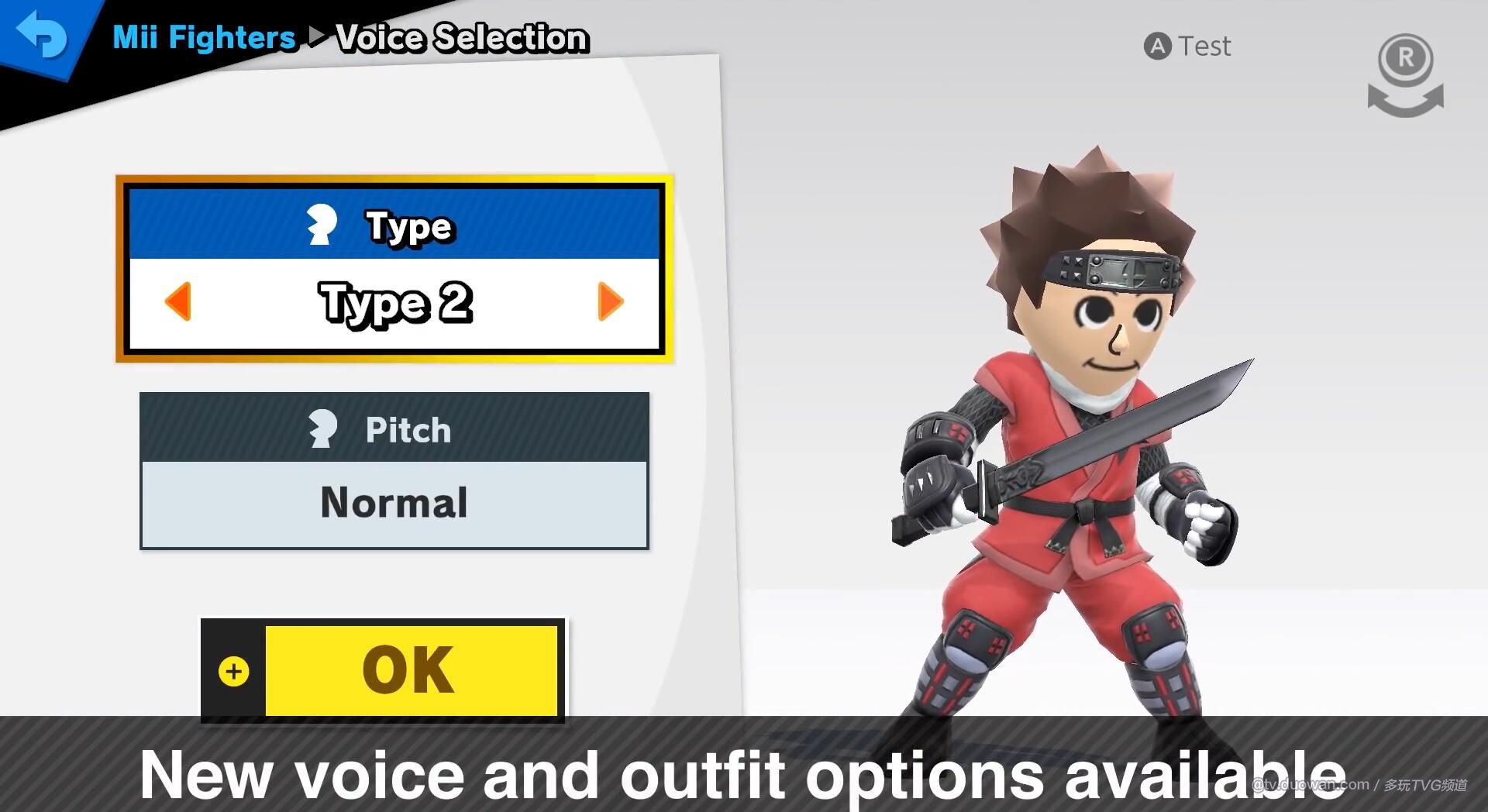 Mii角色还能穿上独特的外观,例如《塞尔达传说:荒野之息》伊贺团套装、《喷射战士2》套装、《ARMS》缎带女孩套装、《豆丁机器人》套装、任天堂Labo套装。