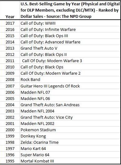 根据实体和数字版的完整销售数据(但不含PC销量),从《现代战争2》开始,一直到去年的《二战》,《使命召唤》都是美国玩家的心头好,其中唯一的例外在2013年,因为当年出现了《GTA5》,所以《幽灵》丢掉了年度冠军。