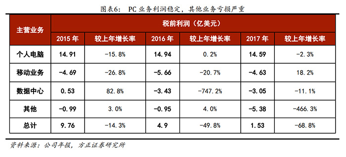 根据联想年报及方正证券的统计数据,联想集团下属的四大业务中,PC业务营收占比高达70%以上,而且也是唯一一个盈利的,2017年税前利润为14.59亿美元,而移动、数据中心及其他业务大幅亏损3-5亿美元不等。