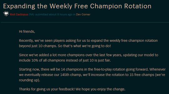 拳头回复的原文也是如此:“从现在起,周免英雄的数量会增加到每周14位。而在我们放出第145位英雄时,我们会将这个数字提升到15(四舍五入)。”,这也就意味着,等未来发布英雄总数量达到145时,周免英雄也将会是15位!