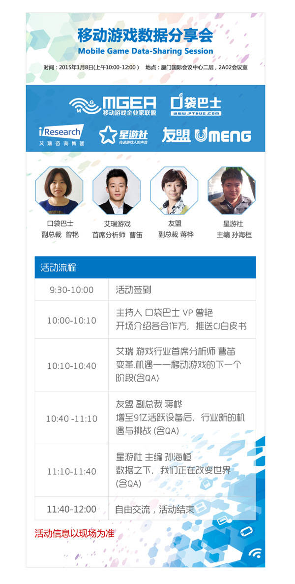 该移动游戏数据分享会由移动游戏企业家联盟(MEGA)主办,口袋巴士、艾瑞和友盟协办。随着分享会举办日期临近,演讲嘉宾以及相关细节也进一步曝光,可谓是亮点颇多。