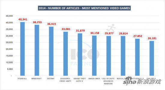 游戏方面,2014年各大游戏新闻标题中提及最多的是《泰坦陨落》、《我的世界》和《命运》,十大榜单中射击游戏占五席。《我的世界》比较奇怪,被提及的总次数在任何月份都是前15名,不过年内总排名位居第二。