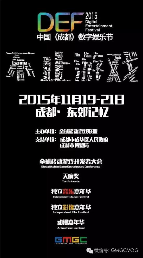 11月19日-21日,由全球移动游戏联盟主办、成都市成华区人民政府、成都市博览局鼎力支持的“中国(成都)数字娱乐节“将在成都(东郊记忆)盛大举行。