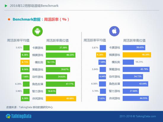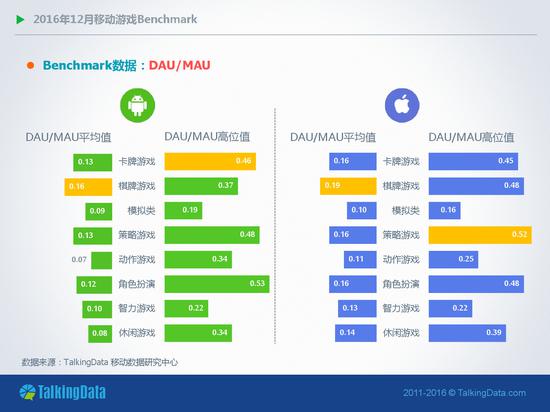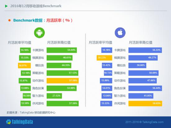 近日TalkingData发布《2016年12月移动游戏Benchmark》。报告中表示,2016年12月,移动游戏用户活跃度(Dau/Mau)在Android和iOS平台上整体维持稳定运行态势,其中,Android平台角色扮演类移动游戏的周活跃率环比上月增长7%,月活跃率则环比增长6.6%;在iOS平台,卡牌类移动游戏的次日留存率环比上月下降8%,7日留存率则环比下降9.4%。
