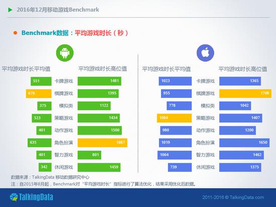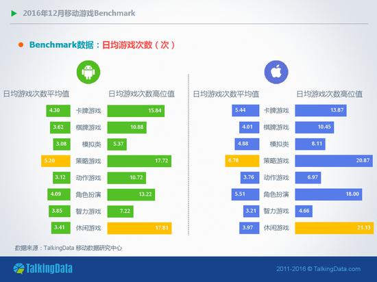 使用时长&次数:2016年12月,移动游戏用户的日均游戏次数和平均使用时长在Android和iOS平台总体上表现平稳,其中,动作类移动游戏的日均游戏次数在Android和iOS平台分别增长5%和1.1%。