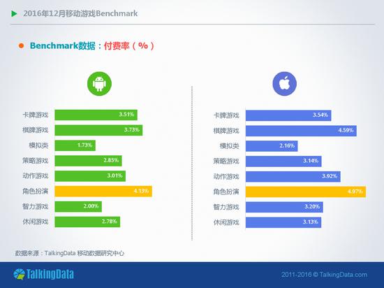 付费率:2016年12月,Android和iOS平台大多数类型移动游戏的付费率总体保持稳定,其中,棋牌类移动游戏的付费率相比上月在Android和iOS平台略有增长;
