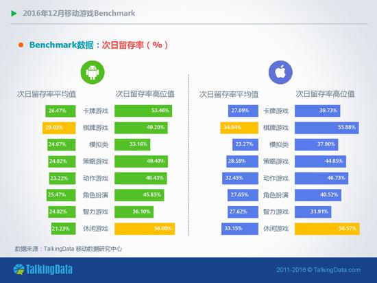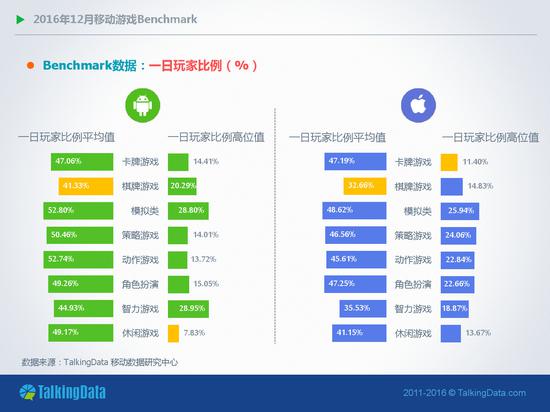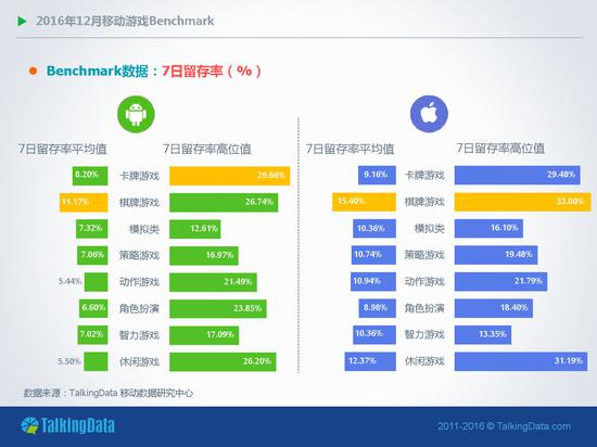 用户留存率:2016年12月,Android和iOS平台大多数类型移动游戏的一日玩家比例相比上月有所增长;在iOS平台,卡牌类移动游戏的次日留存率环比上月下降8%,7日留存率则环比下降9.4%;