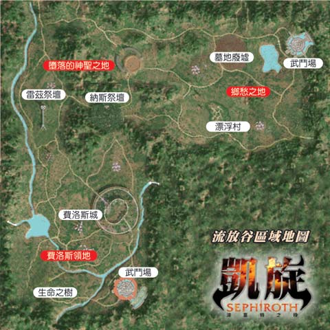 精灵族的区域不同于三面环海的人类族区域,该地是一种完全处于内陆状态的地方。根据故事背景,这个地方原本是人类族所生活的地区,后来是由精灵族重建而成,是由平地与山脉所连结的地形。精灵族是以费洛斯城为中心来进行游戏,费洛斯城是由茂密的森林所环绕的古城,是建盖再古代精灵族遗迹之上。而费洛斯城内部是以大型塔为中心,并有神官建筑、商店、保管所等主要建筑排列着。整个精灵族区域为了配合精灵族本身一种崇高如女神般的形象,而带有相当明亮而深遂的色彩。