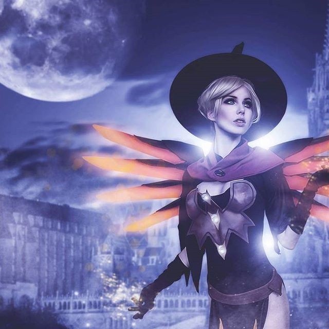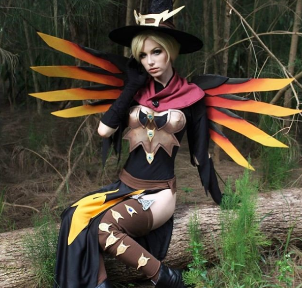 扮成天使的Megan Coffey背着看起来就有些邪恶的橙黑色翅膀,头上戴着魔女的尖角帽,身材也和游戏中的天使一样性感,加上特效堪称完美。