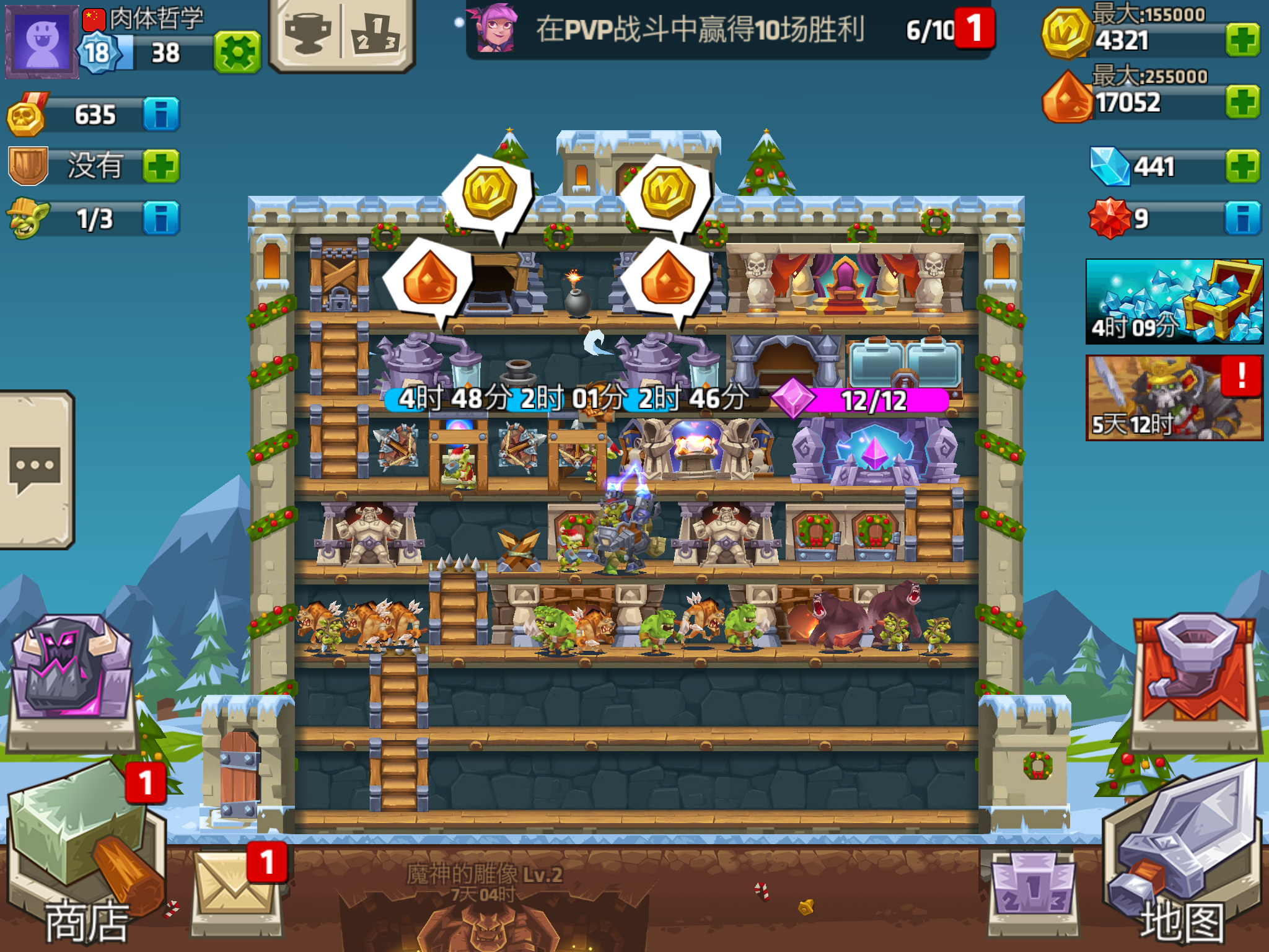 《怪物城堡》作为一个融合了“兽人必须死”和“部落战争”的手游,在玩法上确是有点小新颖,设置陷阱来阻挡来进攻的玩家和PVE关卡,然后再建造不对去攻打别的玩家和PVE关卡,总体来说就是这样的一个强PVP的手游,那么在排陷阱上又不像“部落战争”那么的RTS,而更偏重集中输出的排列组合玩法。当然除了这些游戏的另外一个核心点就是英雄,这也是上战役翻盘的关键,所以偶尔上来点两下,在研究研究防守道具的摆放,还是非常有趣的。(12月22日发布)