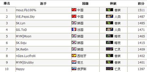 在经历PGL和WC3L总决赛之后,GosuGamers的排名出现了一些变化,PGL新科状元 Fly100%跃居榜首,人皇Sky位居榜眼之位,SK.Lyn位列第三。兽族新贵 nGize.LucifroN位列第8。