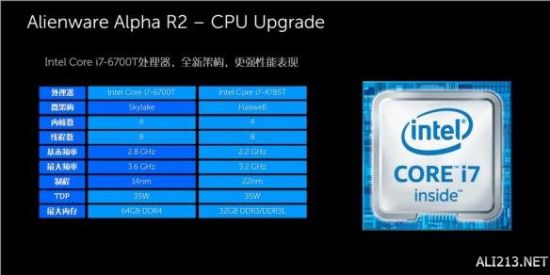 Alienware Alpha 2采用Intel全新的第六代I7-6700T处理器,相比上一代产品在频率上6700T直线提高了400MHz,单从这一项参数来看,就提升了20%。这样的性能提升完全要得益于6代处理器采用的14纳米制程,在功耗不变得情况下让CPU性能更好。