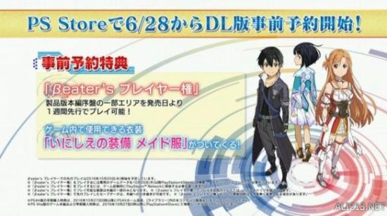 本作于6月28日(今天)开始在PS商店上架,玩家可前去PS商店预订。预约特典是“βeater's 体验权”,预订者可在发售前一周游玩序章的部分地图。预约的玩家还能得到在游戏中可以使用的“古代装备 女仆服”。